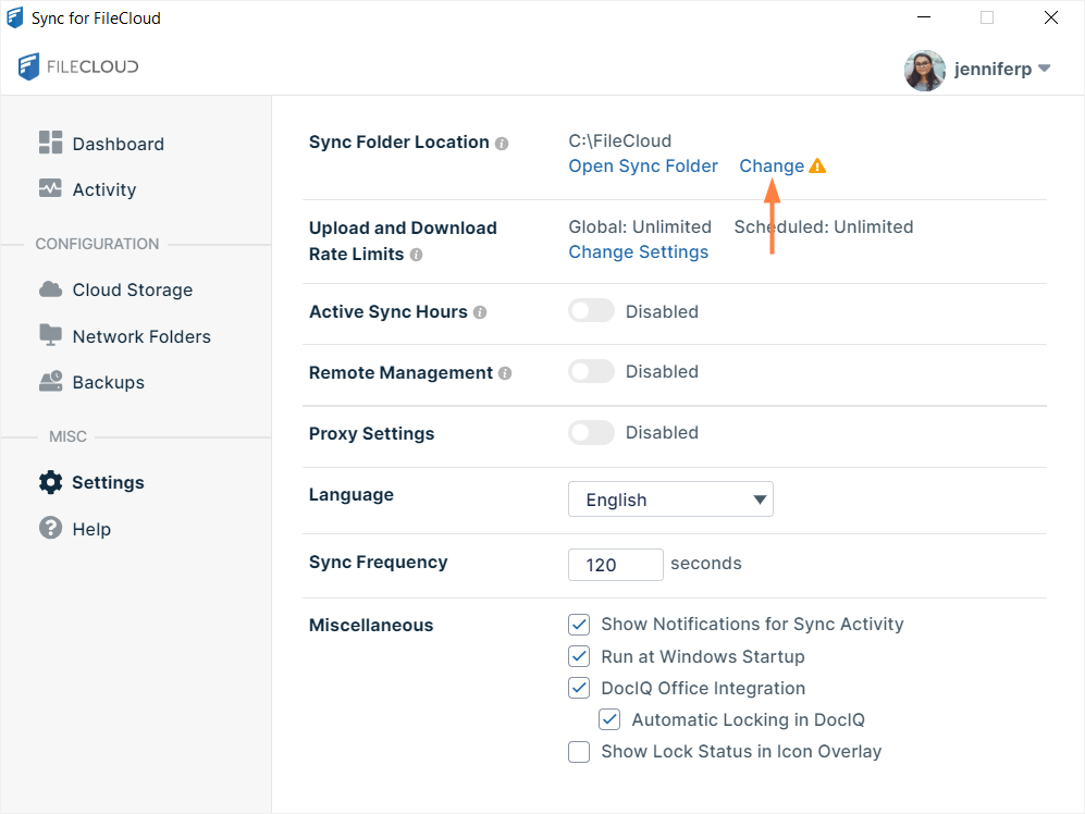 The main dashboard opens to the Settings screen. - Across from Sync Folder Location, click Change.